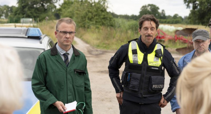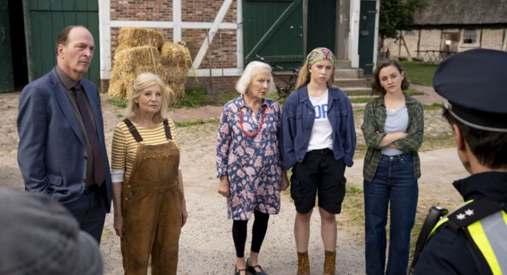 Besuch von der Polizei auf dem Bauernhof (v. li. n. re.):Markus Gellert (Herbert Knaup), Isabel von Brede (Sabine Postel), Marion von Brede (Marie Anne Fliegel), Svenja Hansen (Johanna Götting), Charlie Runge (Mathilde Bundschuh)
