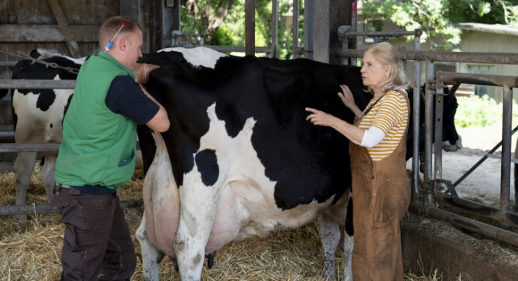 Gellert (Herbert Knaup, li.) schickt Isa (Sabine Postel, re.) zu den Kühen.