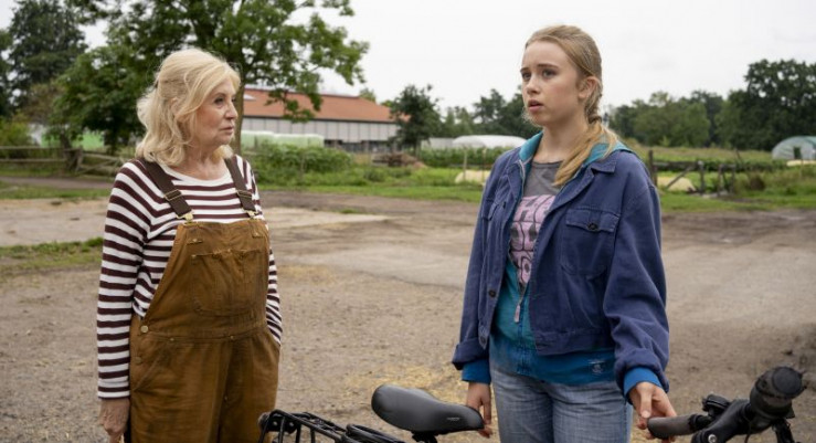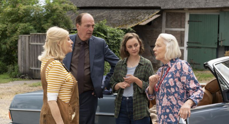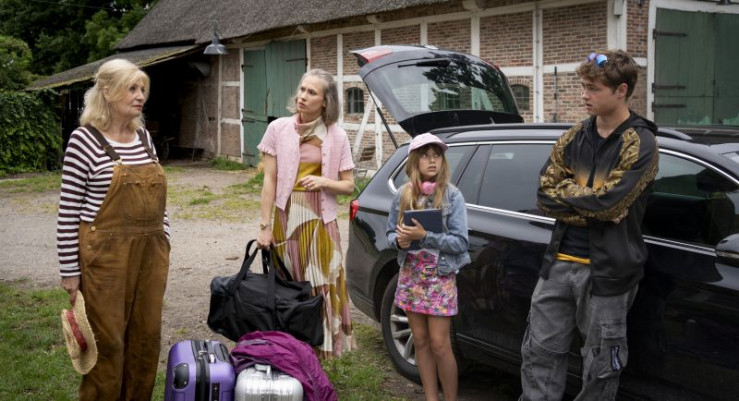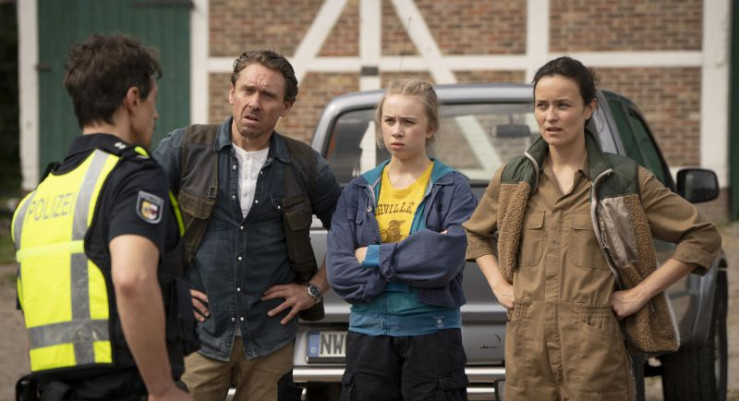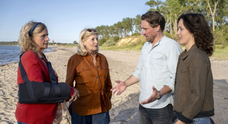 Um Isa (Sabine Postel, li.) zu entlasten, rücken Gellert (Herbert Knaup, 2. v. li.) - mit seiner Tochter Charlie (Mathilde Bundschuh, 2. v. re.) und Isas Mutter Marion (Marie Anne Fliegel, re.) - auf dem Bauernhof an.