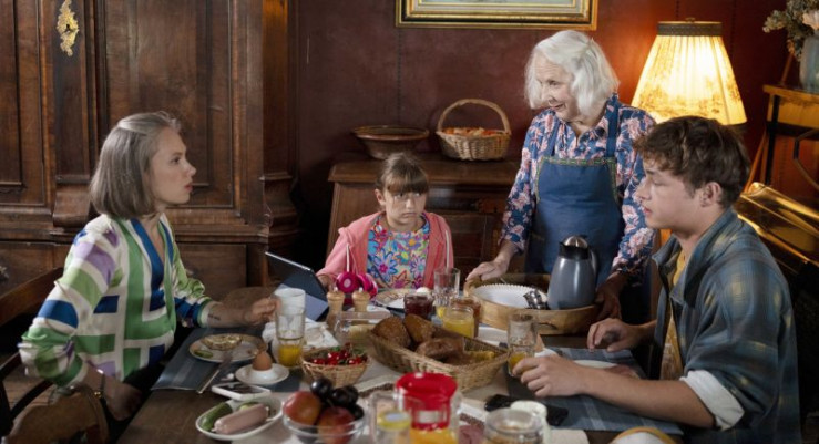 Marion von Brede (Marie Anne Fliegel, 2. v. re.) serviert den Feriengästen Bea Gebhard (Alina Levshin, li.), Emilia Gebhard (Rona Regjepi) und Leon Gebhard (Johannes Degen, re) ihr Frühstück.