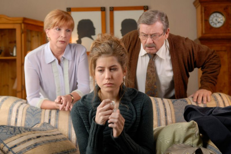 Doro erklärt ihren Eltern nicht ihr Staatsexamen zu machen. Ursela Monn (Ella Talbach), Nora Heschl (Doro Talbach), Wolfgang Winkler (Manfred Talbach).
