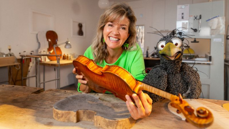Eine Musikbox aus Ahorn- und Fichtenholz: Anne-Sophie Mutter zeigt Rudi (Lennart Morgenstern), woraus eine Geige gebaut wird. © ZDF/Adam Kaiser-Lynch - Honorarfreie Verwendung gemäß AGB im redaktionellen Zusammenhang mit genannter Sendung bei Nennung "Bild: ZDF/Adam Kaiser-Lynch" einschließlich Social Media Einschließlich Social Media© ZDF/Adam Kaiser-Lynch - Honorarfreie Verwendung gemäß AGB im redaktionellen Zusammenhang mit genannter Sendung bei Nennung "Bild: ZDF/Adam Kaiser-Lynch" einschließlich Social Media Einschließlich Social Media