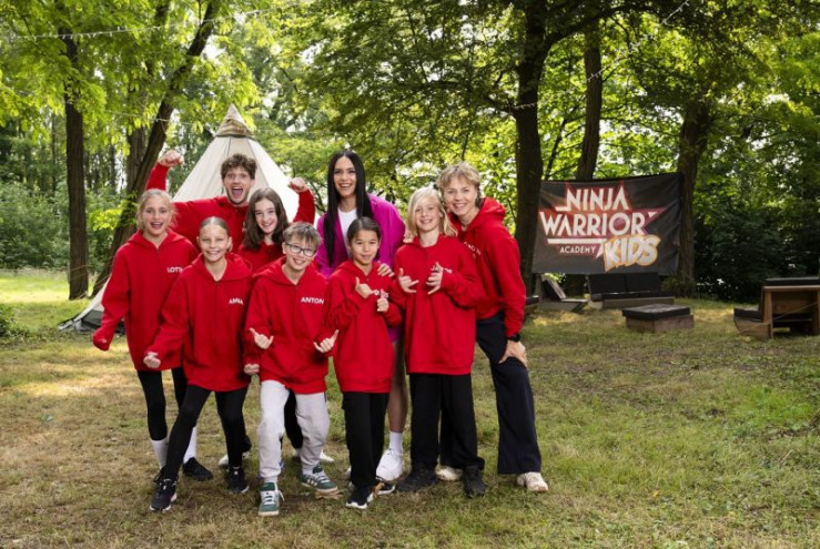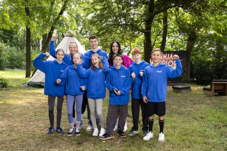 Drehstart für Deutschlands erste Kids-Reality mit Moderatorin Jessica Schöne (ob. Mi.) und prominenten Athlet:innen aus "Ninja Warrior Germany" (Melanie Schmidt, ob. 2.v.li., Ada Theilken, un.re., Lukas Homann, ob.li. und Moritz Hans, un. 3.v.re.)
