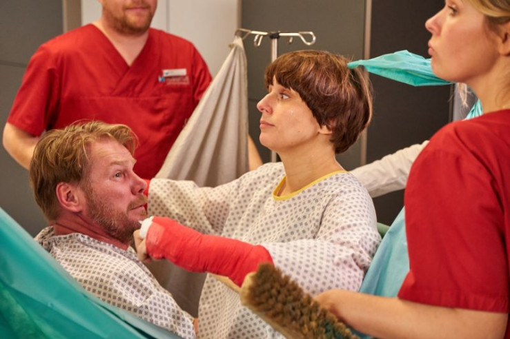 Alex Rode (Jan Hartmann, r.) und Dr. Caro Diehl (Jytte-Merle Böhrnsen, l.) sehen sich mit Margot Röver (Heike Thiem-Schneider) den Po ihres Mannes Wolfgang Röver (Hartmut Volle) an, der mit 22 blutigen Schrotkugeln versehen ist.