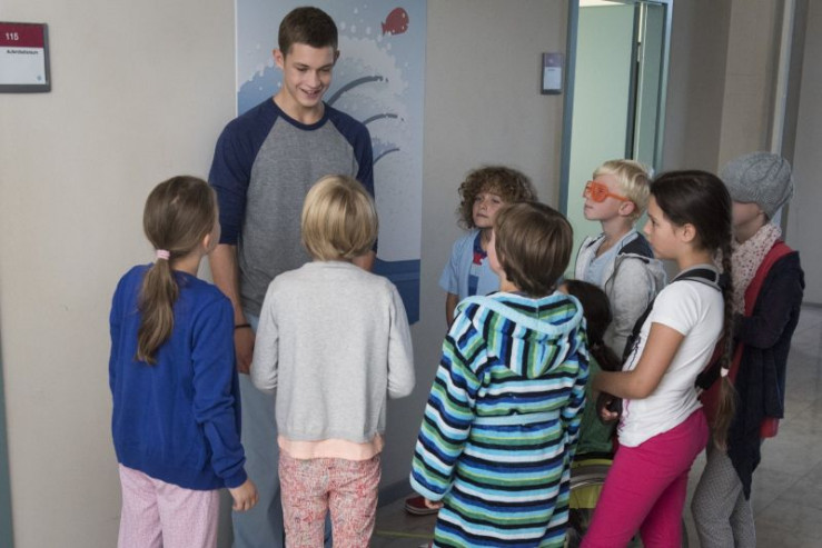 Jonas (Damian Hardung) wird von den Kindern der Kinderstation umringt. Sie wollen alles über den Club erfahren.