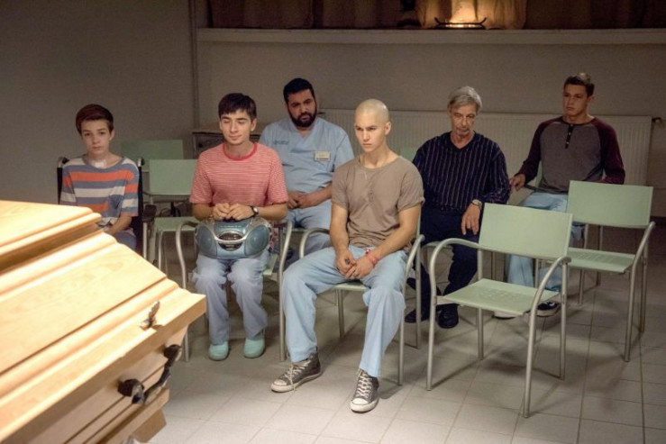 V.l.: Hugo (Nick Julius Schuck), Toni (Ivo Kortlang), Dietz (Sahin Eryilmaz), Leo (Tim Oliver Schultz), Rudi (Rolf Berg) und Jonas (Damian Hardung) nehmen von einem guten Freund Abschied.