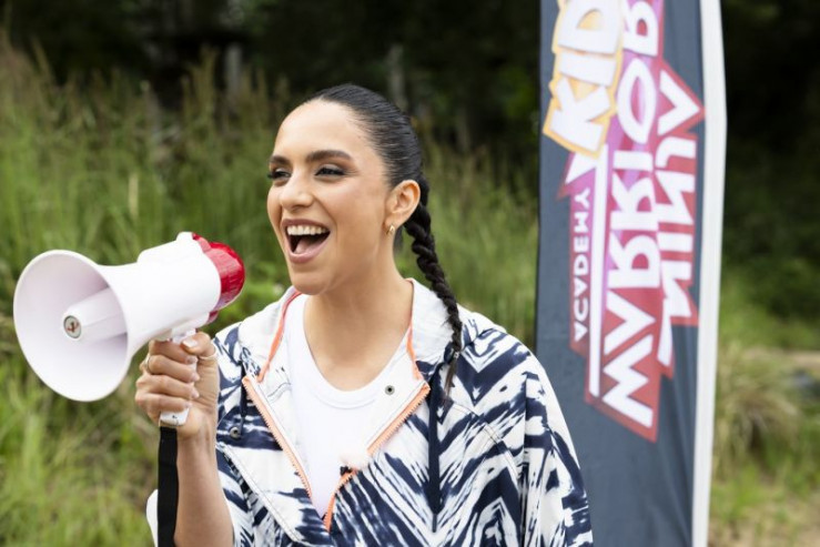 Drehstart für Deutschlands erste Kids-Reality mit Moderatorin Jessica Schöne (ob. Mi.) und prominenten Athlet:innen aus "Ninja Warrior Germany" (Melanie Schmidt, ob. 2.v.li., Ada Theilken, un.re., Lukas Homann, ob.li. und Moritz Hans, un. 3.v.re.)
