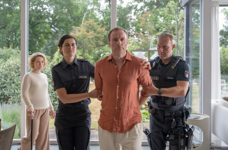 Nachdem die Tatwaffe eines bisher ungeklärten Falles bei Frank Stolpe (Mark Waschke) gefunden wurde, wird dieser vor den Augen seiner Frau (Angelina Häntsch, li. im Hintergrund) festgenommen.