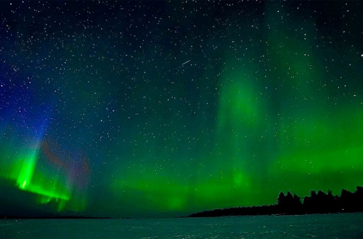 Bei idealen Wetterbedingungen hat man vielleicht das Glück, die Polarlichter über dem gefrorenen Inari-See zu bestaunen.