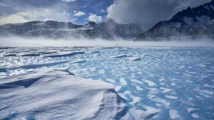 Katabatische Winde treiben Schnee über die Oberfläche des Lake Untersee in der Ost-Antarktis, an dessen Grund riesige Stromatolithen liegen, die nirgendwo sonst auf der Erde zu finden sind.