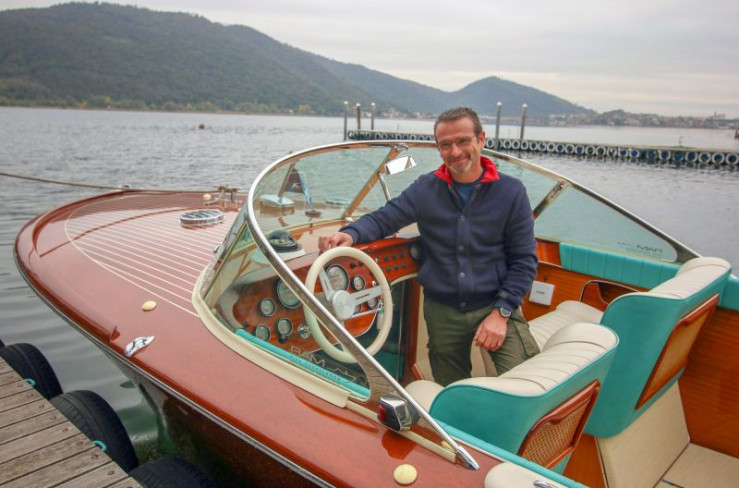 Luigi Paltenghi fährt in einem Riva-Boot auf den Iseosee hinaus.
