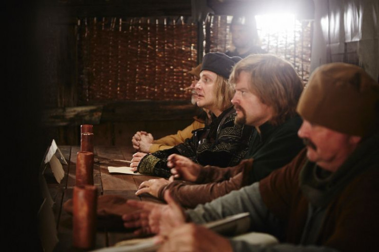 Der Archäologe Howard Carter (Carsten Strauch, 3.v.l.) und seine Geldgeberin (Judith Richter, 2.v.r.) erwarten mit Spannung die Öffnung des Sarkophags. Sie sind umgeben von Journalisten (Alexander Schubert, l., Holger Stockhaus, 2.v.l. und Max Giermann, r.).