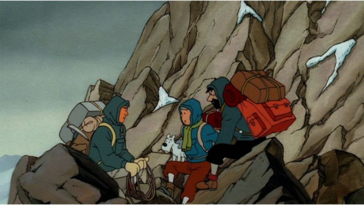 Tim (M.) und Kapitän Haddock (r.) machen zusammen mit Tharkey (l.) und Struppi eine Pause auf dem Berg, bevor ein Sturm aufzieht.