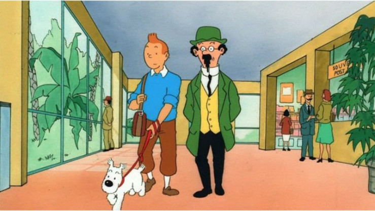 Tim (l.), Struppi, Kapitän Haddock, Professor Bienlein (r.), Piotr Klap und Laszlo Carreidas werden auf dem Flug zum Raumfahrtkongress nach Sydney entführt. Auf einer kleinen Insel treffen sie auf Rastapopoulos, der es auf das Geld von Carreidas abgesehen hat, doch Tim gelingt die Flucht.