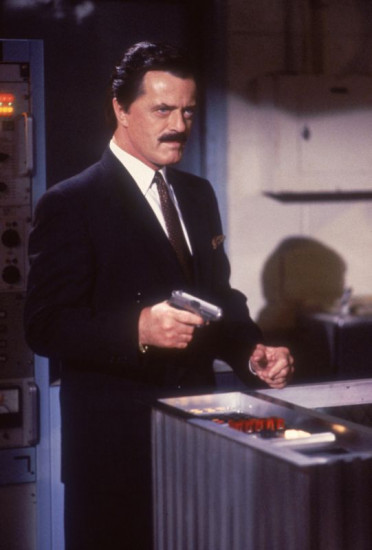 Quentin Hapsburg (Robert Goulet, r.) plant einen Bombenanschlag auf das Institut von Dr. Meinheimer (Richard Griffiths, l.), der im Auftrag der Regierung Alternativen zur Energiegewinnung erforschen soll. Lt. Frank Drebin (Leslie Nielsen, 2. v. l.) und Jane Spencer (Priscilla Presley, 2. v. r.) versuchen das zu verhindern.