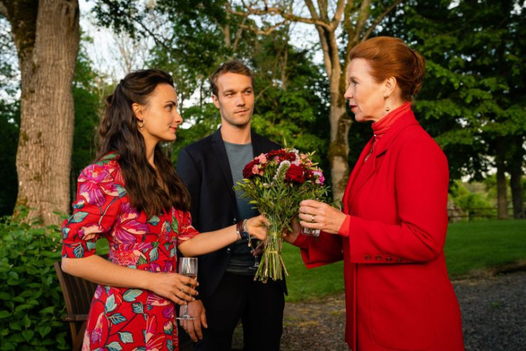 Jette (Paula Schramm, l.) schenkt ihrer leiblichen Mutter Lilemor Borgen (Marion Kracht, r.) das erste Mal Blumen zum Muttertag. Steffen (Max Woelky, M.), der Anwalt der Familie Borgen, hat sie zur Party begleitet.