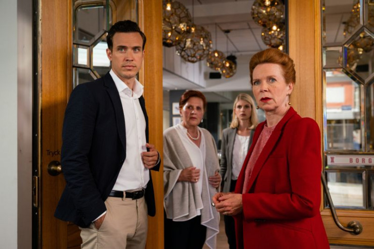 Die Borgens, Malte (Tobias van Dieken, l.), Tante Bea (Eva Maria Bayerwaltes, 2.v.l.), Nele (Nina Brandt, 2.v.r.) und vor allem Lilemor (Marion Kracht, r.) sind mehr als überrascht, als Jette in die Vorstandsitzung platzt.