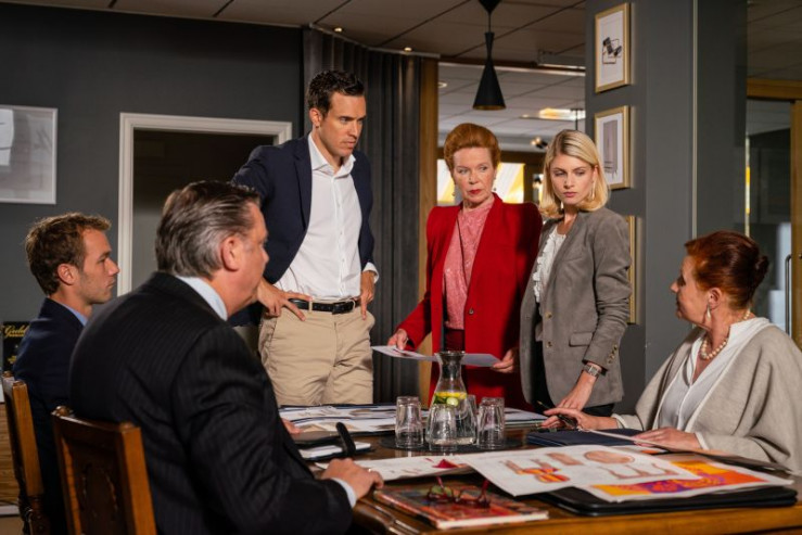Malte (Tobias van Dieken, M.) und Nele (Nina Brandt, 2.v.r.) präsentieren dem Vorstand ihre neuen Entwürfe. Ihre Mutter Lilemor (Marion Kracht, 3.v.r.) hat jedoch ihre eigenen Designs mitgebracht. Tante Bea (Eva Maria Bayerwaltes, r.) und Steffen (Max Woelky, l.) werden Zeuge der Auseinandersetzung (Mike Getsky, Statist, 2.v.l.).