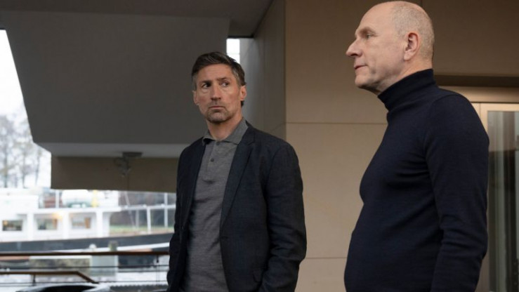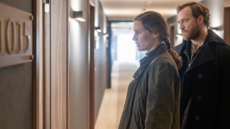 Ann Kathrin Klaasen (Picco von Groote, l.) und Frank Weller (Tom Radisch, r.) stehen vor dem Hotelzimmer von Herrn Claudius. Klaasen und Weller vermuten, dass Claudius ihnen bezüglich des Verschwinden seines Enkels nicht die Wahrheit sagt.