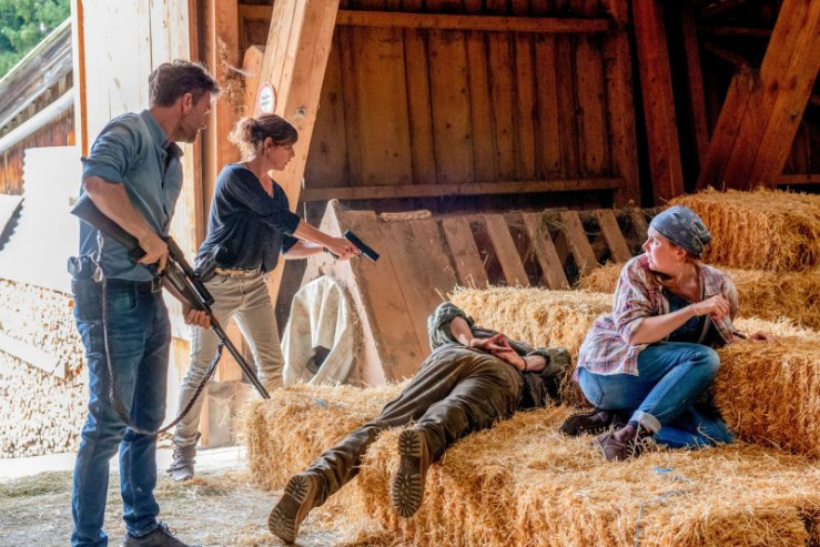 Lukas (Jakob Seeböck, r.) und Nina (Julia Cencig, M.) nehmen einige Waldarbeiter unter die Lupe, unter anderem Veith Gruber (Simon Jaritz, l.) Er begegnet dem SOKO-Team nicht gerade freundlich und kooperativ.