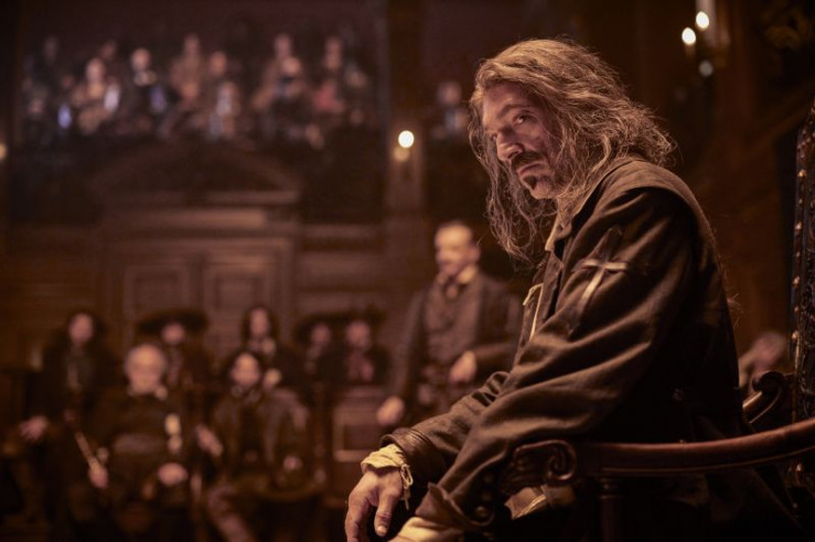 Kardinal Richelieu (Eric Ruf, l.), lässt sich von Capitaine de Tréville (Marc Barbé, 2.v.l.) berichten, dass die drei Musketiere Porthos (Pio Marmaï, 3.v.l.), Aramis (Romain Duris, 3.v.r.) und Athos (Vincent Cassel, 2.v.r.) bei verbotenen Duellen mit D'Artagnan (François Civil, r.) erwischt wurden.