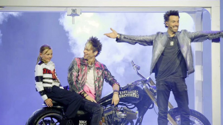 Die 10-jährige Ida prankt ihre Mutter bei einer Show der Ehrlich Brothers. Ihre Eltern, Janina (l.) und Jens (r.), müssen vor Showbeginn nervige Aufgaben erledigen und zum Beispiel Verkleidung tragen.