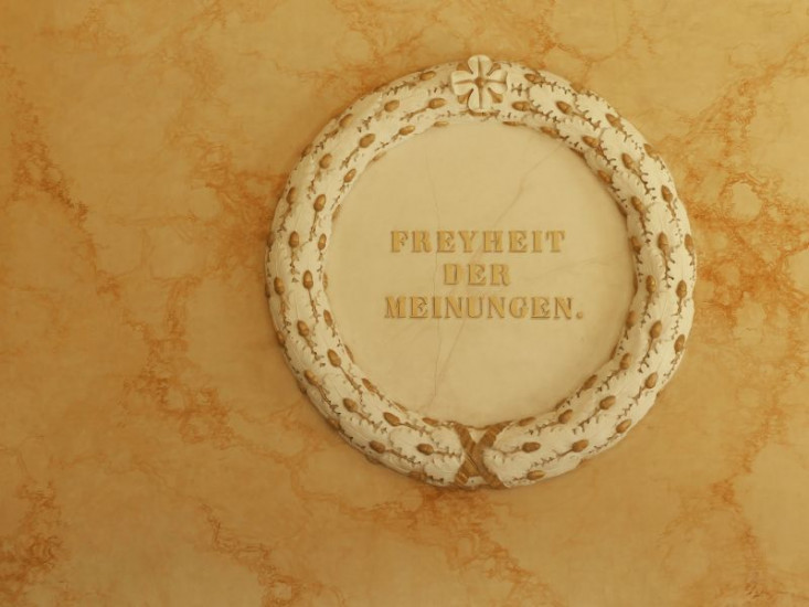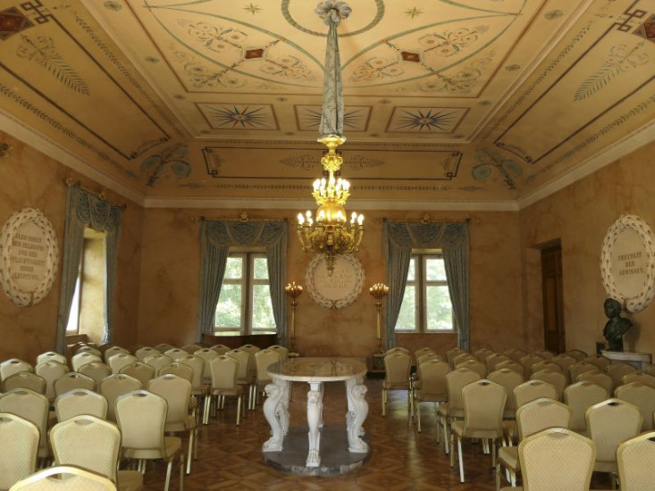 Konstitutionssaal mit Medaillons und Inschriften, die die Prinzipien der Verfassung, die König Max I. Joseph den Bayern 1818 gewährte, illustrieren, gestaltet von Leo von Klenze, Gräflich Schönborn'sches Schloss, Gaibach, 1820.
