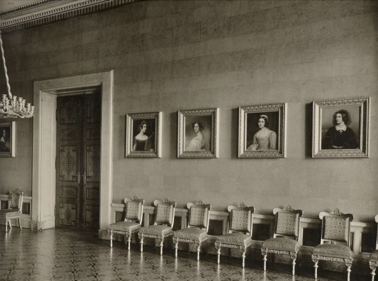 Schönheitsgalerie (1827/50) u. a. mit den königlichen Mätressen, gemalt von Joseph Stieler (1781-1858) im Auftrag des Ludwigs I., Festsaalbau der Münchner Residenz, Fotografie, um 1937.