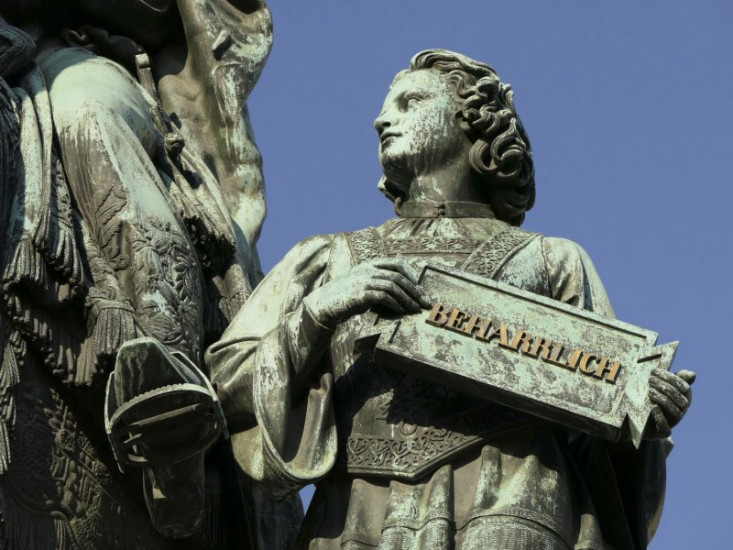 Reiterdenkmal König Ludwigs I. (reg. 1825-1848) am Münchner Odeonsplatz mit dem Motto seiner Herrschaft "GERECHT" und "BEHARRLICH", gestaltet vom Bildhauer Max Carl Widnmann (1812-1895), 1857/62.