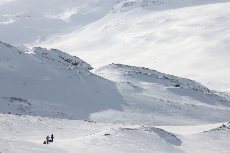 Weiße Weiten und in der Ferne die Hütte Alesjaure Fjällstuga.