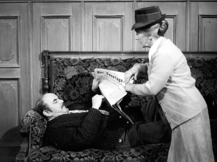 Der Großvater (Ludwig Schmid-Wildy, Mitte) soll sich wie im Himmel fühlen. Nanni Haslinger (Erni Singerl, links) und ihre Tochter Ev (Yvonne Brosch) wollen es ihm recht gemütlich machen. Frau Nanni tut es aus Berechnung, Ev hat den Großvater wirklich gern.