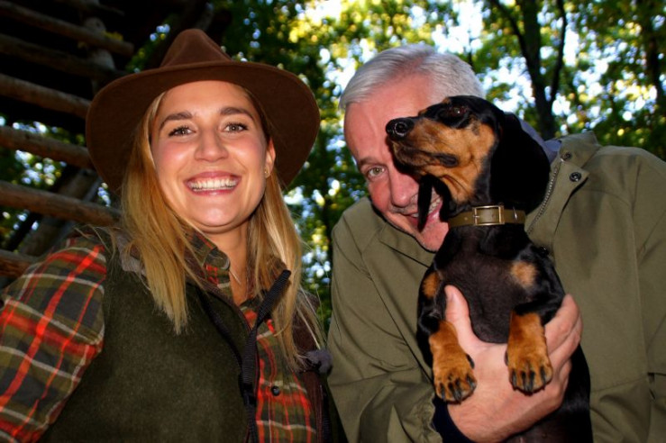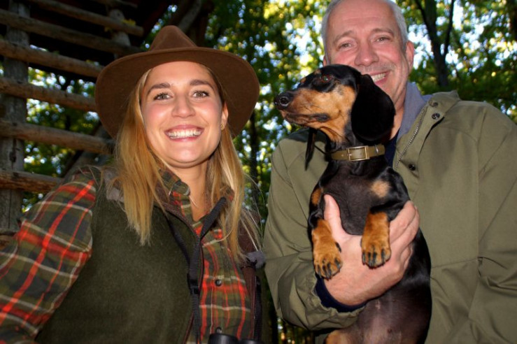 Jägerin Lisa Müller mit Alexander Herrmann und Dackel Alma.