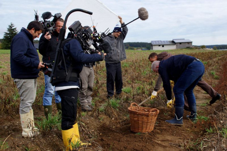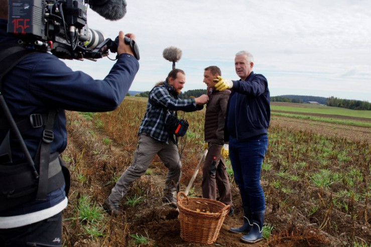 Alexander Herrmann (rechts vorne) mit Karl Schelter (rechts hinten) bei der Kartoffelernte mit dem Kamerateam.