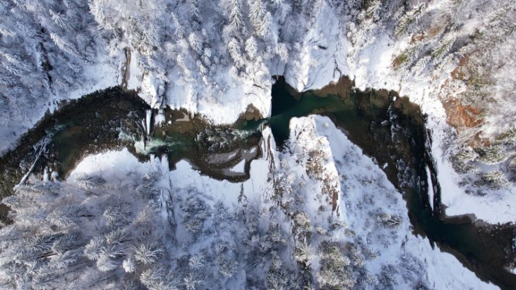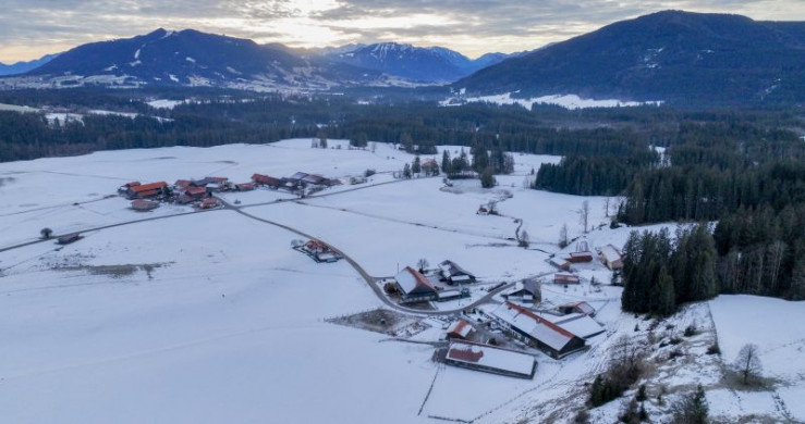 Aus der Vogelperspektive: Höfe im winterlichen Ammertal.