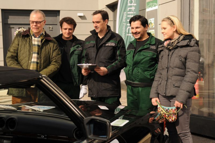 Mike erkennt erleichtert, dass Flori und Tuncay den Oldtimer von Herrn Meiser rechtzeitig repariert haben. Von links: Herr Meiser (Uwe Neureuter), Florian Brunner (Tommy Schwimmer), Mike Preissinger (Harry Blank), Tuncay Kaya (Levent Özdil) und Yvonne Preissinger (Alexa Eilers).