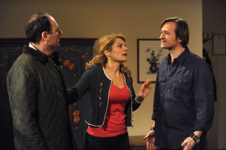 Als der betrunkene Hubert Uschi besucht und dabei auf Gregor trifft, eskaliert die Situation zwischen ihnen. Von links: Hubert Kirchleitner (Bernhard Ulrich), Uschi Guggenmoser (Silke Popp) und Gregor Brunner (Holger M. Wilhelm).