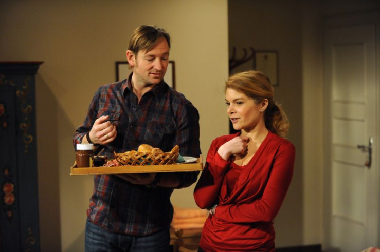 Uschi freut sich über die Brotzeit, die ihr Gregor zur Aufmunterung bringt. Von links: Gregor Brunner (Holger M. Wilhelm) und Uschi Guggenmoser (Silke Popp).