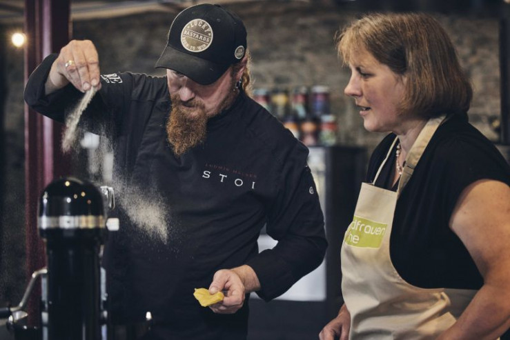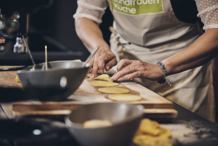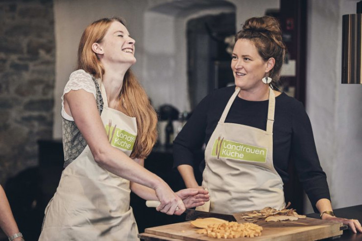 Lucki Maurer würzt das Essen, Anja Raithel schaut dabei zu.