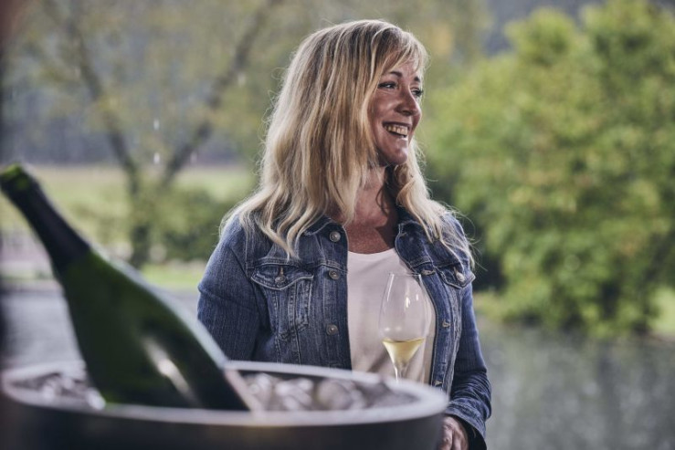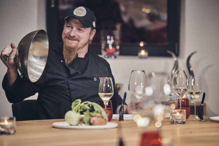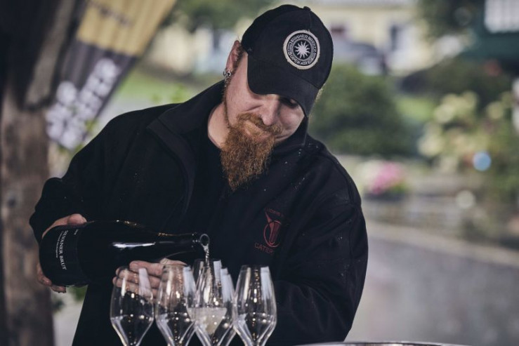 Spitzenkoch Lucki Maurer schenkt fränkischen Winzersekt aus.