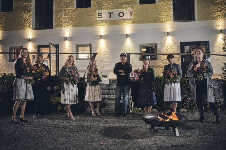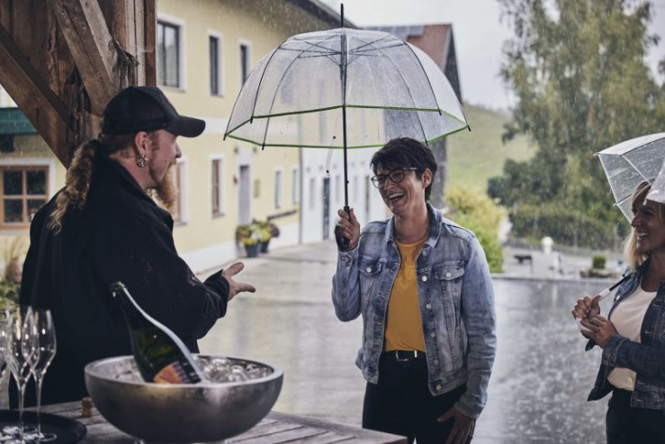 Von links: Lucki Maurer, Spitzenkoch und selbst Landwirt aus Niederbayern, begrüßt Karina Schwarzbauer und Nicole Roth auf seinem Hof.