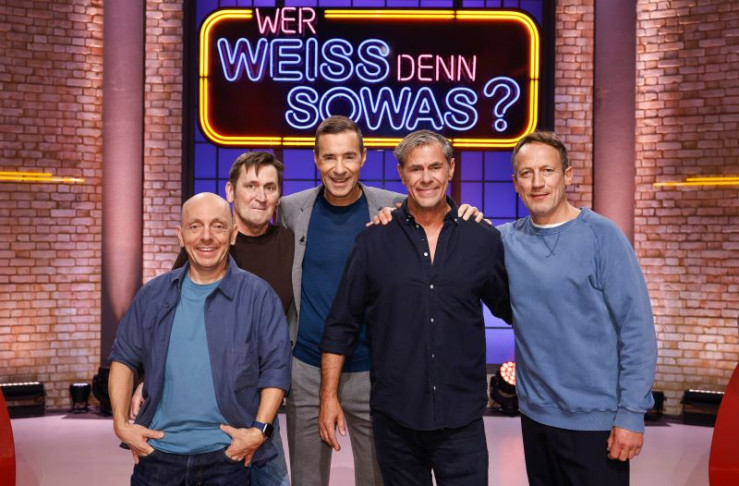 Moderator Kai Pflaume (M.) und seine Rateteam-Kapitäne Bernhard Hoëcker (l.) und Wotan Wilke Möhring (r.) begrüßen in dieser Sendung den Schauspieler Ingo Naujoks (2.v.l.) und den Schauspieler Sven Martinek (2.v.r.).