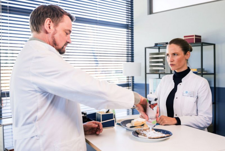 Durch ihren Patienten inspiriert, schließen Dr. Julia Berger (Mirka Pigulla, l.) und Dr. Marc Lindner (Christian Beermann, r.) eine Wette ab: Hält Julia es länger ohne Zucker aus oder Marc ohne Äpfel?