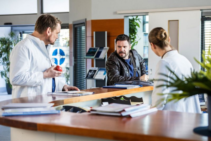 Jonathan Laurentis (Thomas Drechsel, M.) trifft im Eingangsbereich des JTK auf Dr. Julia Berger (Mirka Pigulla, r.) und Dr. Marc Lindner (Christian Beermann, l.), die ihn aufgrund seiner Schmerzen im Fuß direkt als Patient aufnehmen.
