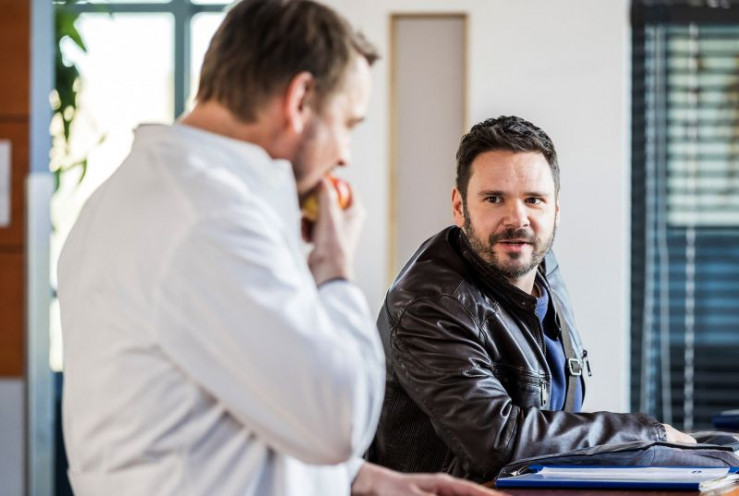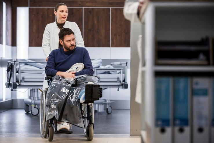 Dr. Julia Berger (Mirka Pigulla, hinten) muss Jonathan Laurentis (Thomas Drechsel, vorne) nach Sichtung des Röntgenbildes stationär aufnehmen. Eine Operation wird nötig sein.