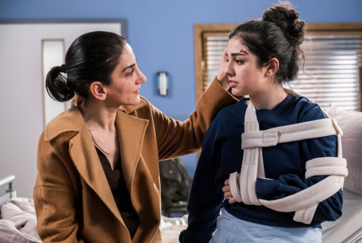 hört, dass der Heilungsprozess ihrer gebrochenen Schulter einige Wochen dauern soll. Dila Nouri (Saman Giraud) fragt sich, warum ihre Tochter deswegen so aufgebracht ist. (v.l.n.r.: Saman Giraud, Philipp Danne, Jakob D?Aprile, Tanaz Molaei)