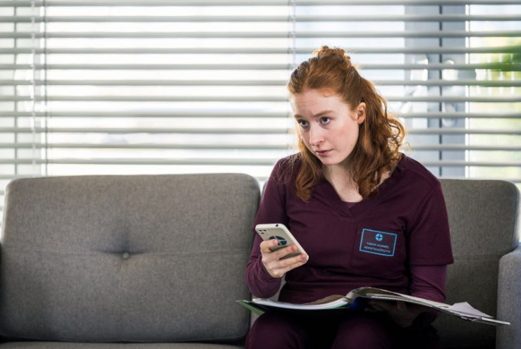 Assistenzärztin Tamar Hummel (Linda Kummer) liest ein E-Mail vor, die eine entscheidende personelle Umstrukturierung im JTK erklärt.