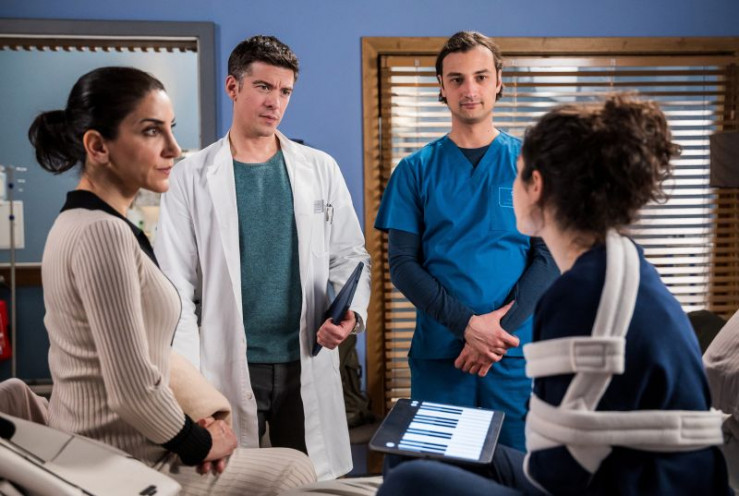 Ayra Nouri (Tanaz Molaei) wird von Dr. Ben Ahlbeck (Philipp Danne) und Assistenzarzt Ivo Maric (Jakob D?Aprile) in der Notaufnahme des JTK aufgenommen. Begleitet wird die junge Patientin von ihrer Mutter Dila Nouri (Saman Giraud). (v.l.n.r.: Saman Giraud, Tanaz Molaei, Jakob D?Aprile, Philipp Danne)
