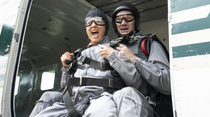 Nina (Cordelia Wege, li.) geht mit Tim (David Bredin, re.) Fallschirmspringen.