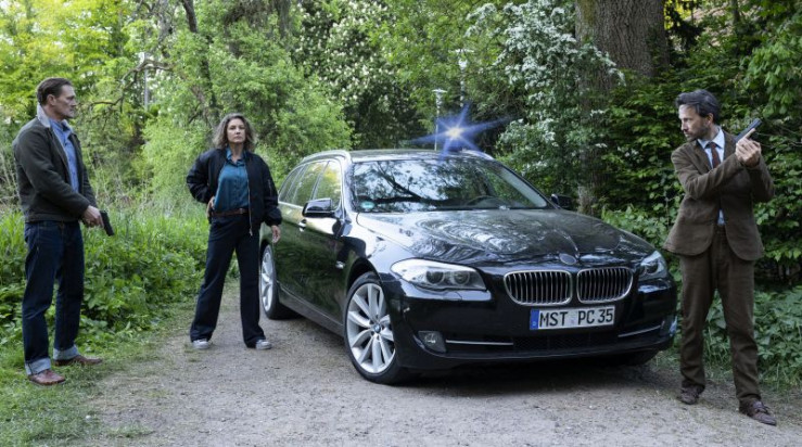 Nina (Cordelia Wege, Mitte) fährt mit ihren Kollegen Bittner (Franz Dinda, re.) und Engelmann (David Bredin, li.) zu Teresas Grundstück.