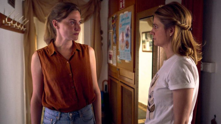 Bine (Maike Johanna Reuter, li.) und Katja (Ines Marie Westernströer) und beobachten Paul mit Laura.